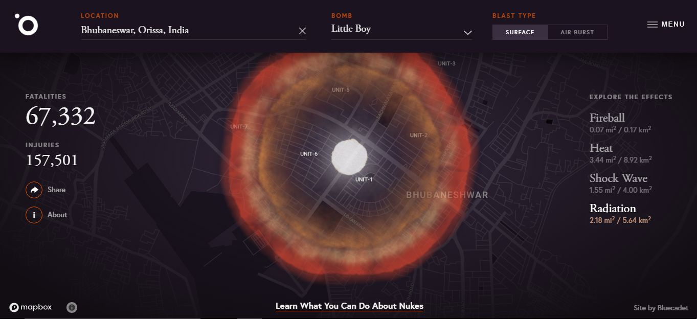 It lets you know the effects of fireballs, radiations, shockwaves, and heat. It will also show you an estimate of the damage that would have occurred if the bombs were dropped there. You can also select the type of atomic bomb. All you have to do is to turn on your GPS and select the area on which you want to see the effect of the different bombs.